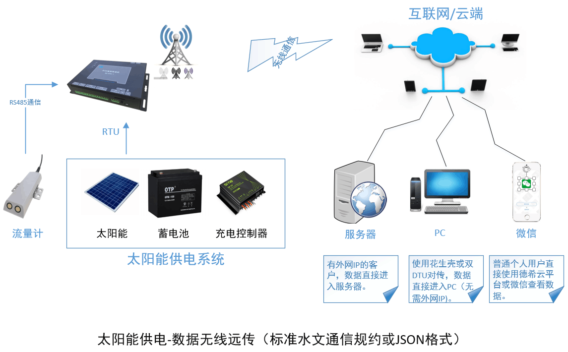 DX-LSX-1多普勒超聲波流量計(jì)通過RS485接入到DX-RUT-1遙測終端機(jī)上,控制器采用太陽能供電,RTU通過GPRS可以將數(shù)據(jù)發(fā)送至相應(yīng)的服務(wù)器,當(dāng)客戶沒有服務(wù)器時(shí)可以采用花生殼或雙DTU對傳,數(shù)據(jù)直接接入PC。DX-RTU-1遙測終端機(jī)支持標(biāo)準(zhǔn)水文通信規(guī)約或者JSON格式數(shù)據(jù)包。